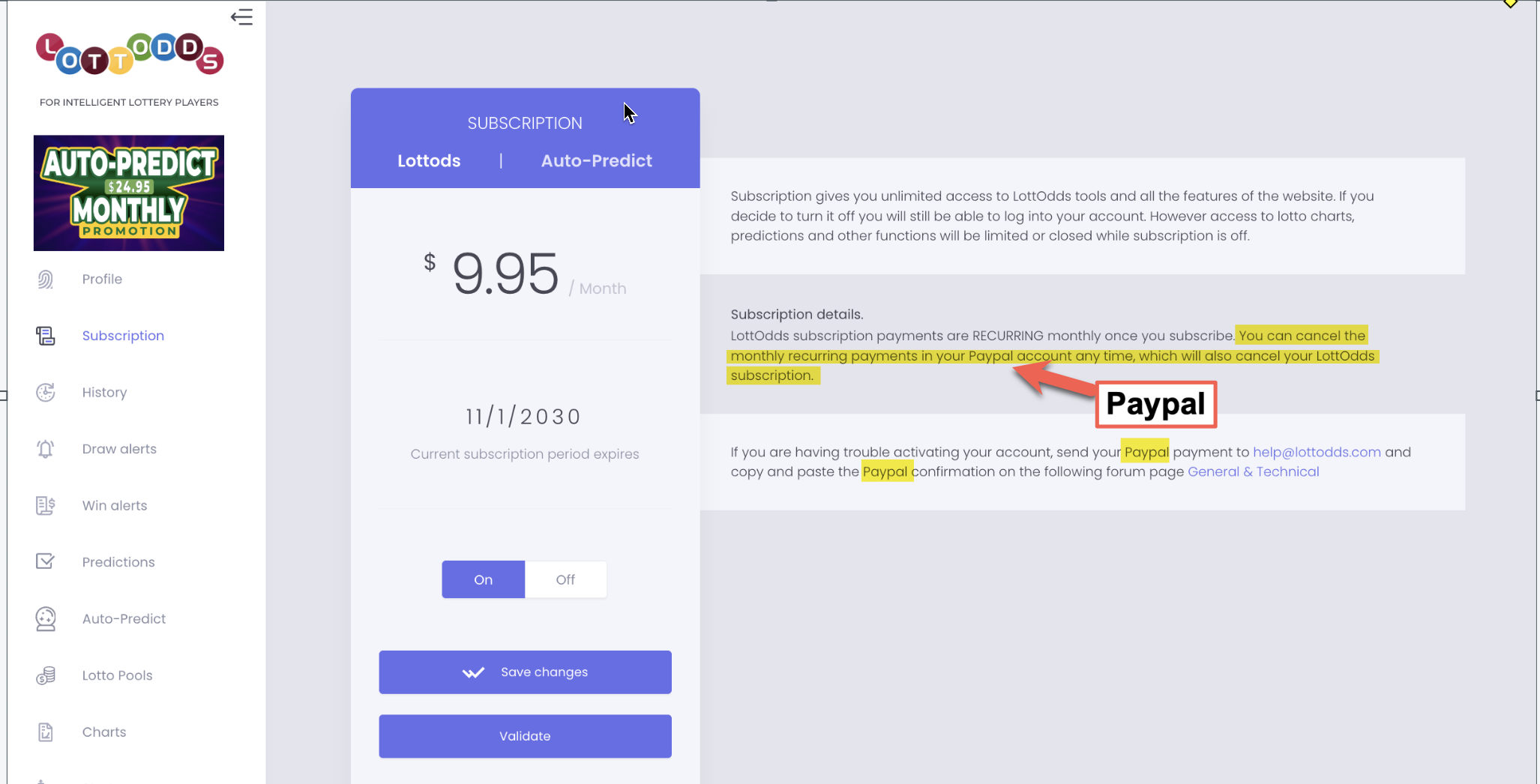"The only website I used to set up the $9.95 subscription was Lottodds!" .....Which means you setup a Paypal account when you subscribed to lottodds.