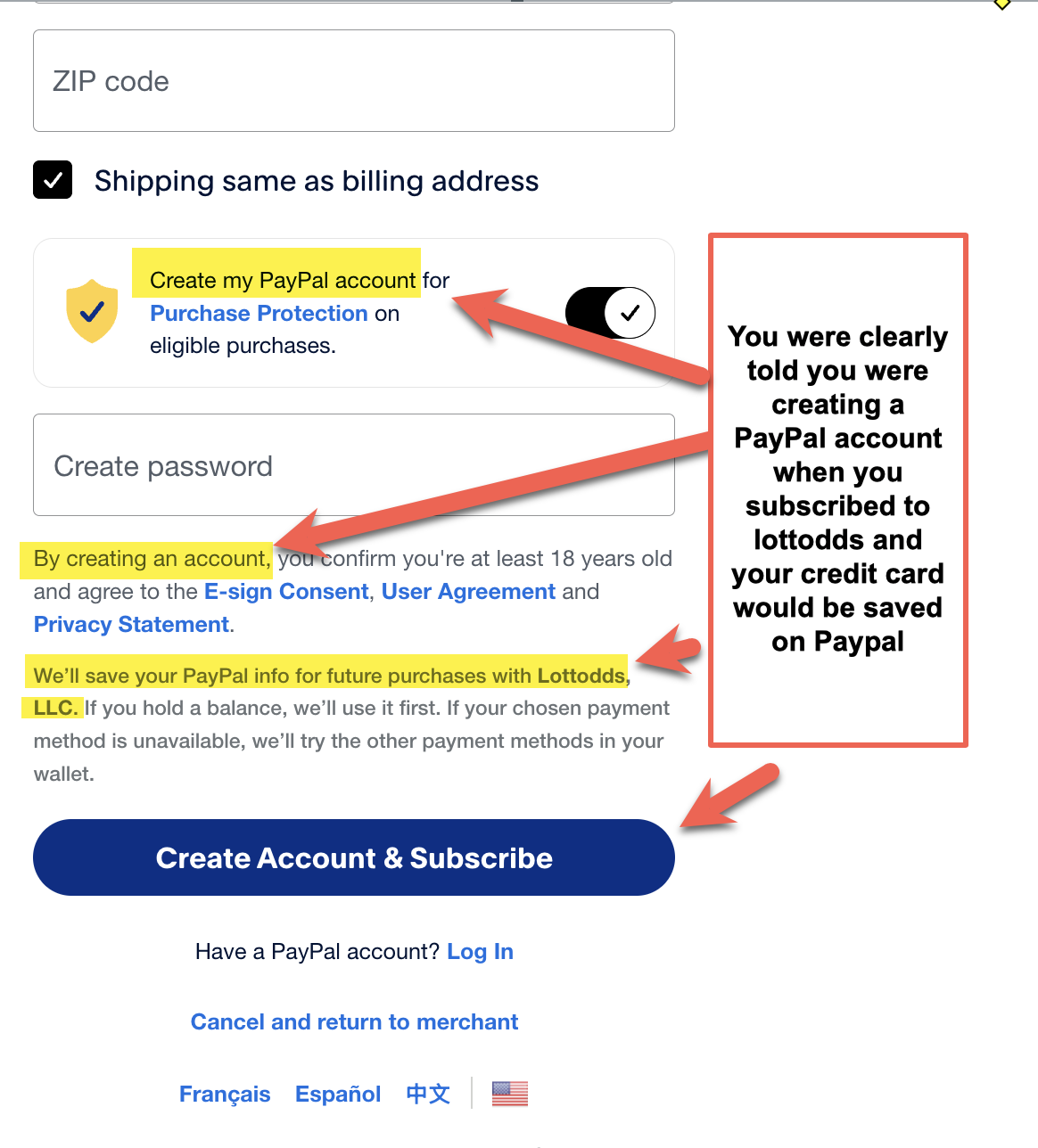 You then used the PAYPAL by credit card feature to setup the lottodds subscription. Paypal then used your credit card info to setup your Paypal account.